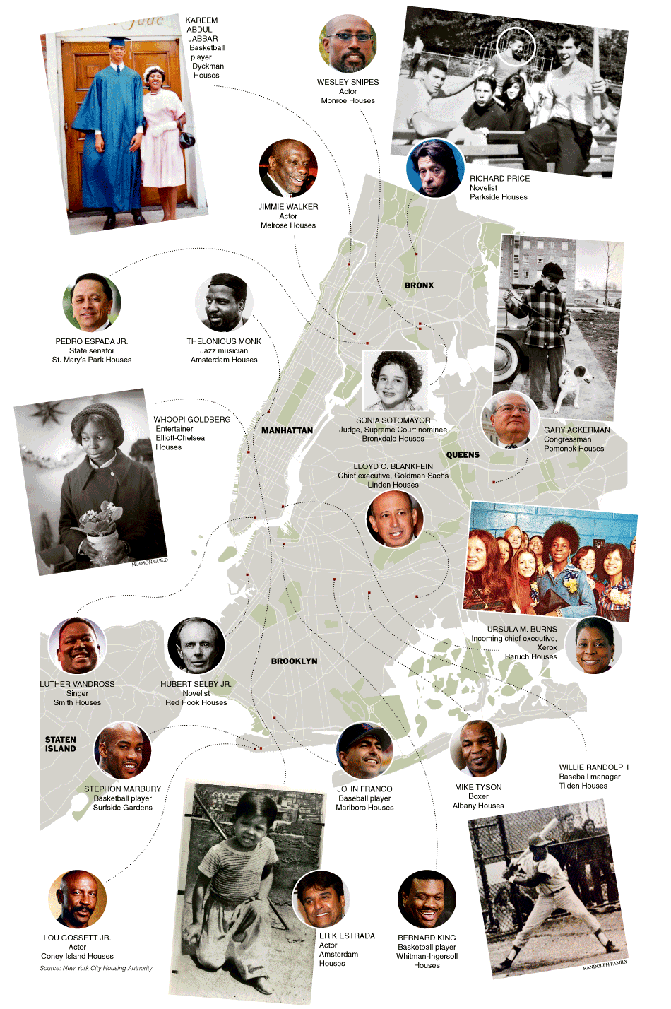Because of the recent Sotomayor nomination, Lizette Alvarez and Michael Wilson interviewed a number of high profile ‘graduates’ of the Projects in NY City for a recent article in the NY Times. In addition to (obviously) Sonia Sotomayor, can you say Jay Z., Howard Schultz (Starbucks), Lloyd C. Blankfein (Goldman Sachs), Whoopi Goldberg, Kareem Abdul-Jabbar, Wesley Snipes, and the list goes on.