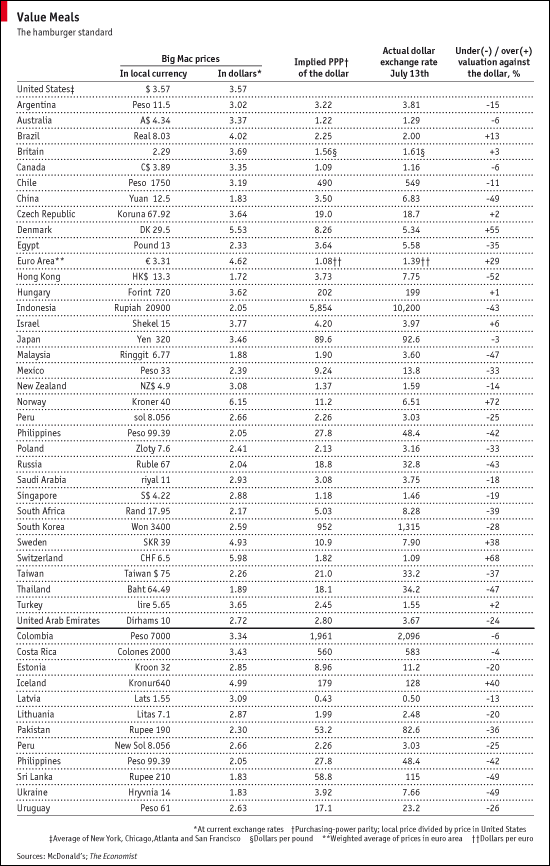 Anyway, this week’s 2009 survey says that should the Big Mac price in a country translated into dollars be above $3.57, its cost in America, the currency is overvalued; if it is below that benchmark, it is undervalued.