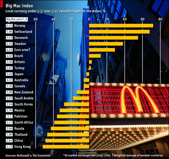 Just to review, The Economist has been publishing their (not so tongue-in-cheek) Big Mac Index since 1986. It’s a reality check on world-wide currency exchange rates, based on the concept of Purchasing-Power Parity.