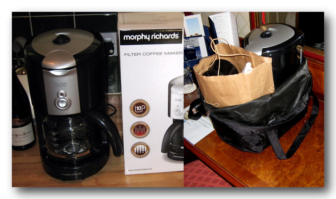 Coffe Maker On The Counter (Left) And In Its Travel Bag (Right)