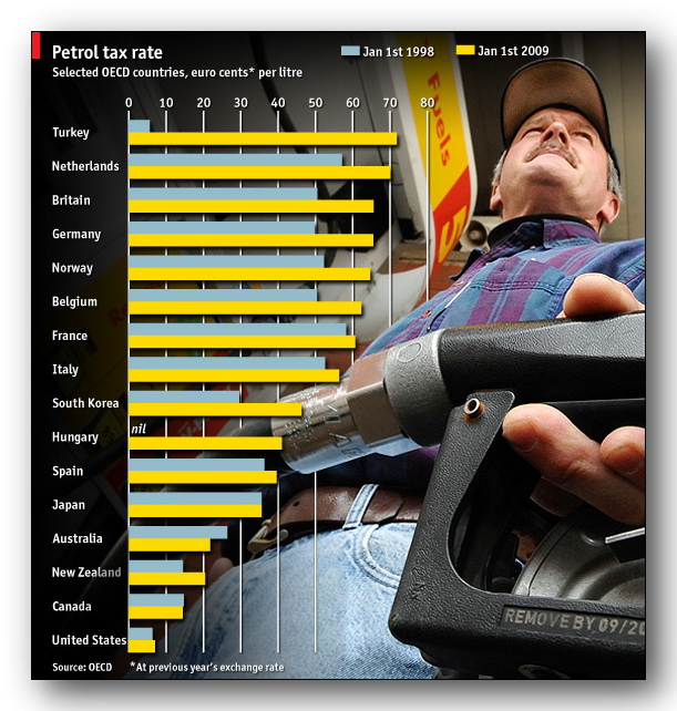 Last week the Economist published OECD data showing the change in gas taxes for a number of countries. As you can see, the jump in taxes for some countries is pretty astounding.