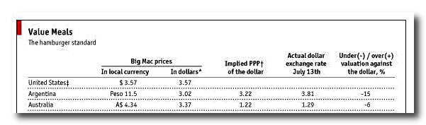 Just to review, The Economist has been publishing their (not so tongue-in-cheek) Big Mac Index since 1986. It’s a reality check on world-wide currency exchange rates, based on the concept of Purchasing-Power Parity.