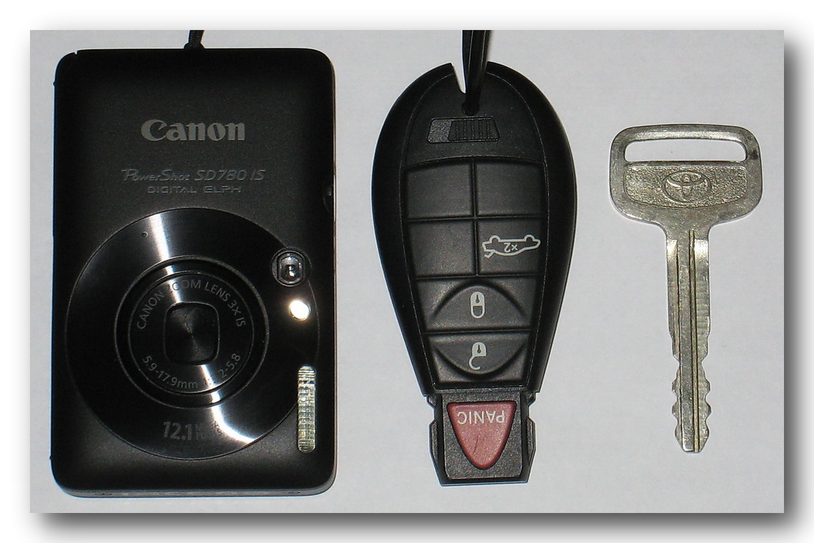 In the middle of this picture is the Car Key in question. Am I really expected to carry this around in my pocket, or even better, wear it on a gold chain around my neck? Compare it to the old fashioned key to my Toyota Tacoma Truck on the right. N’uff said.