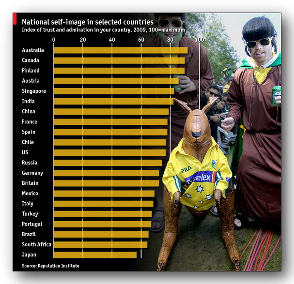 Ignoring the very weird background graphic, what are we to make of the results of a survey taken by the Reputation Institute and reported in The Economist on National Self-Image?