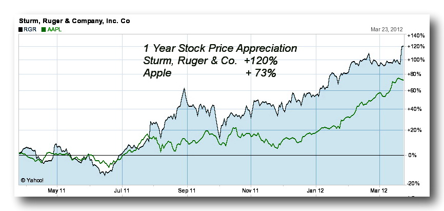 Among my personal favorites is Sturm, Ruger & Company (NYSE: RGR) who, unlike Apple, manufacture their product in the USA. In fact they manufacture so much of it, they have stopped taking orders for the next few months so they can catch up with production.