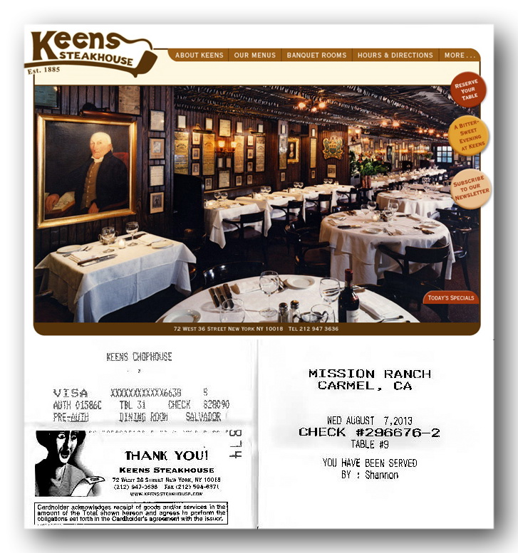 Tabs from Keens Chophouse in Manhattan and Mission Ranch in Carmel, CA